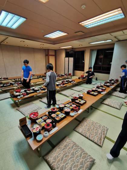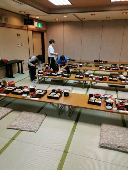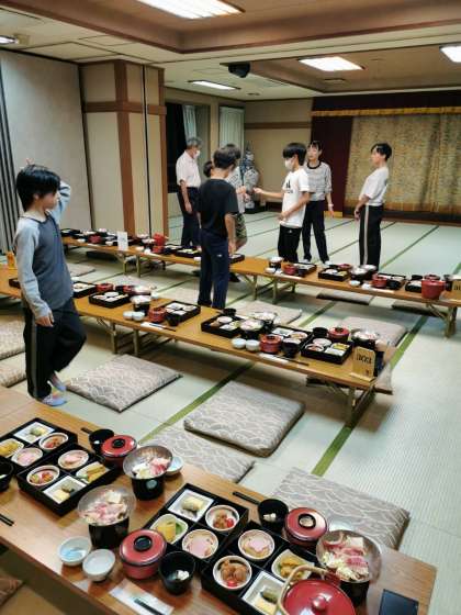 入浴を済ませ、いよいよ夕食。食事係が準備しています。