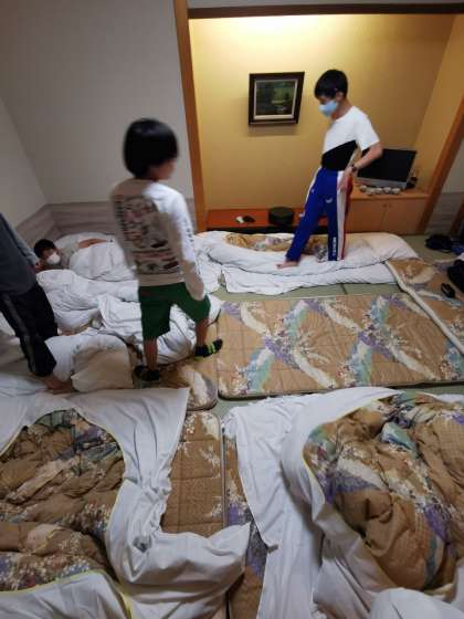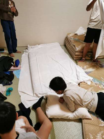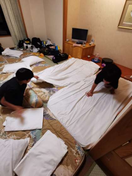 いよいよ就寝準備。シーツを敷いたり明日の持ち物の用意をしたりしています。