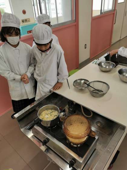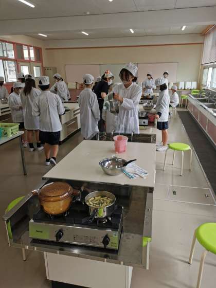 調理実習をしています。ごはんとみそ汁を作ってみようということでてきぱきと進めています。おいしそうにできています。