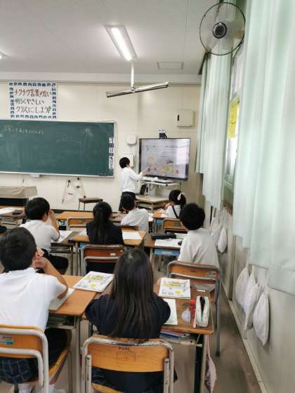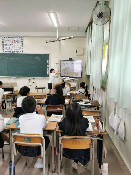 コンパスを使って距離を確かめています。コンパスをどう使うと2つの距離の違いがわかるかを実際にみんなの前で説明しています。