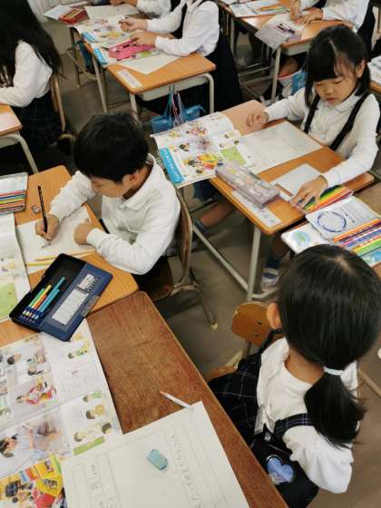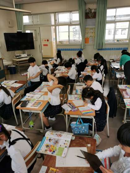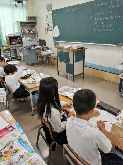 先週やってみた靴洗いの様子をまとめています。どんなふうにして洗った、水の色がどうなった、など絵や文でかいています。