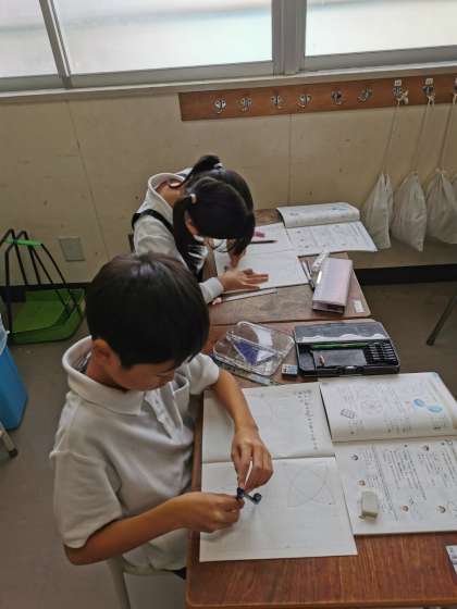 コンパスで円を描いています。複雑な図をどうやって描けばいいか、考えながら描いています。