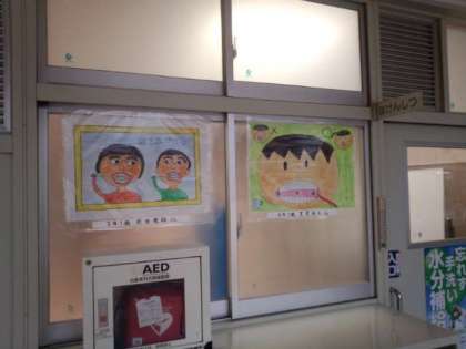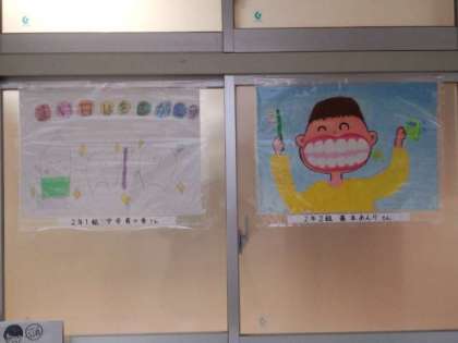 今朝、保健室の前を通ると、児童が描いた「歯をみがこう」の啓発ポスターが掲示されていました!