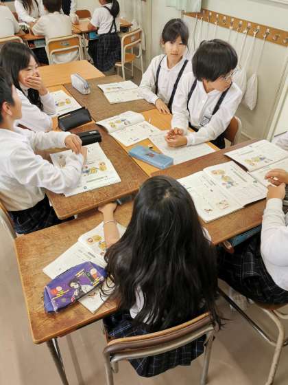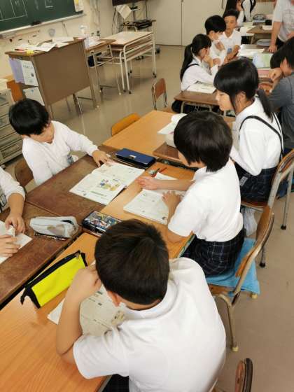 和と洋新聞を作ります。グループで何を記事にするかについて意見を出し合っています。