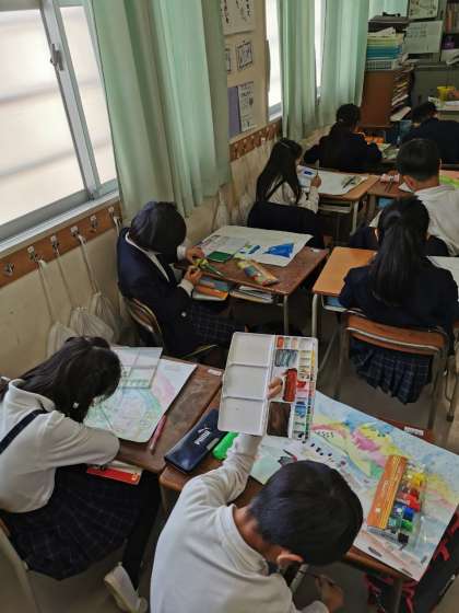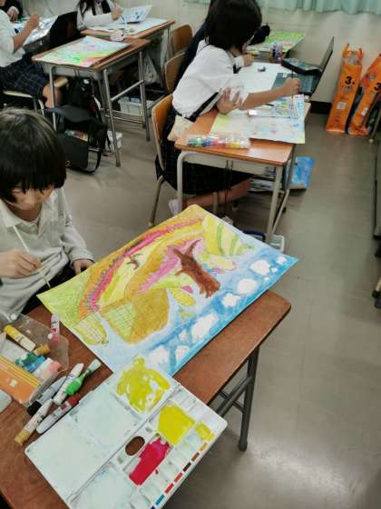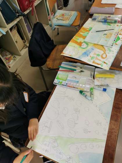 絵の続きをしています。だいぶ着色が進みました。細かな点をつけてさらに表現豊かにしています。