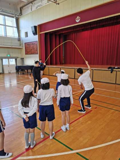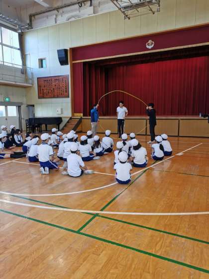 5、6年対象にトップアスリートによる夢・授業を行いました。世界大会で活躍されたことがあるファットマンクルーの方に来ていただき、ダブルダッチを楽しみました。とても元気に、丁寧にご指導いただきました。