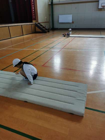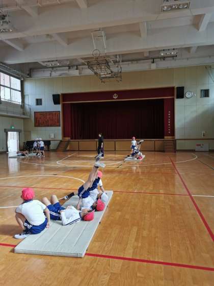 背支持倒立や前回り、後ろ回りの練習中です。マットからはみ出ないように気をつけてしています。