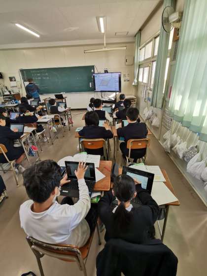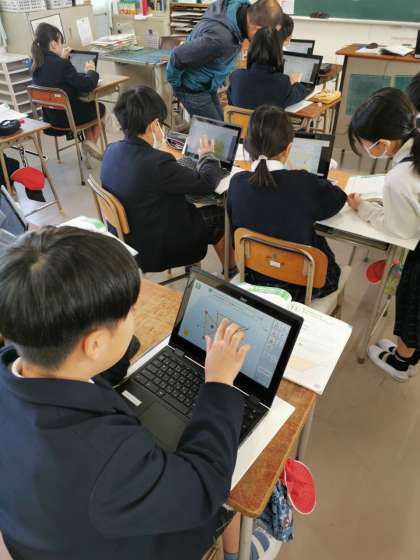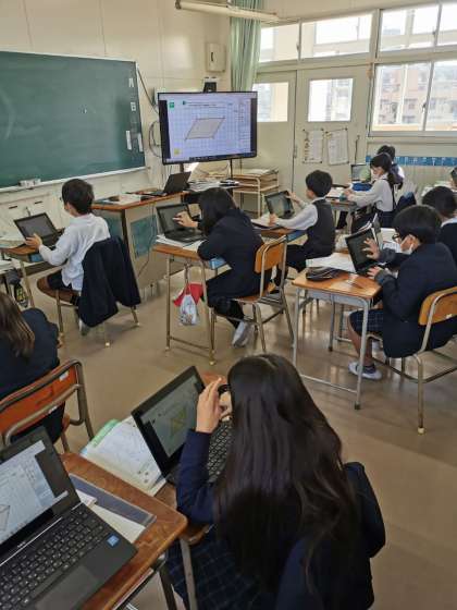 デジタル教科書を使って、平行四辺形の面積の調べ方を考えています。