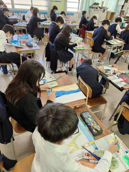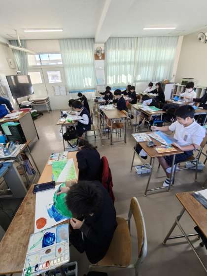 自然をテーマにした絵を描いています。ていねいに塗ろうとする人だけでなく、表したいものの色の使い方に気をつけている人が多かったです。