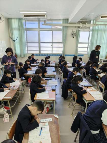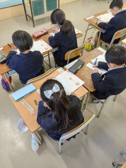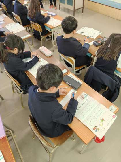 書き初めをしています。「なかよくあそぶ」とひらがなを書いています。お手本を何度も見ながらお手本のように書こうとがんばっています。