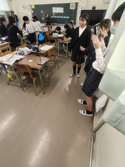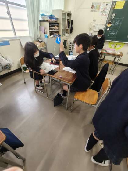 ふりこの長さと往復の時間をストップウォッチで測って確かめています。タブレットで記録もしています。
