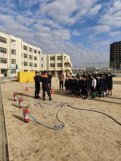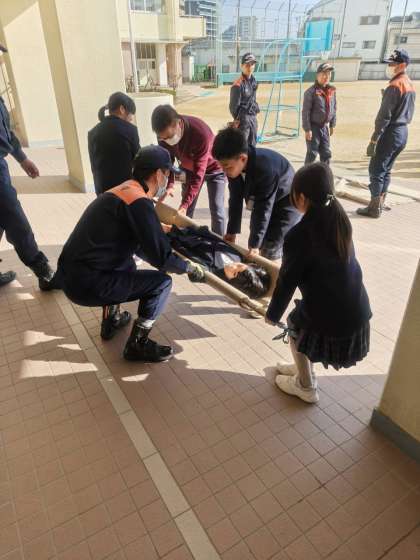 西淀川消防署の方に来ていただき、火災や災害時について、煙体験、水消火器、担架搬送を実際に体験して学びました。