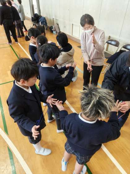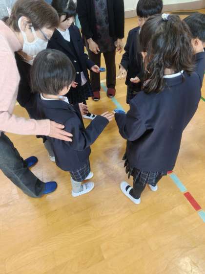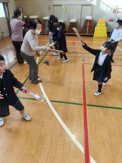 今日は地域の方にお越しいただいて昔遊びをしました。遊び方を教えていただいたり、いっしょになって遊んだりしました。感想も皆さんにお伝えすることができました。