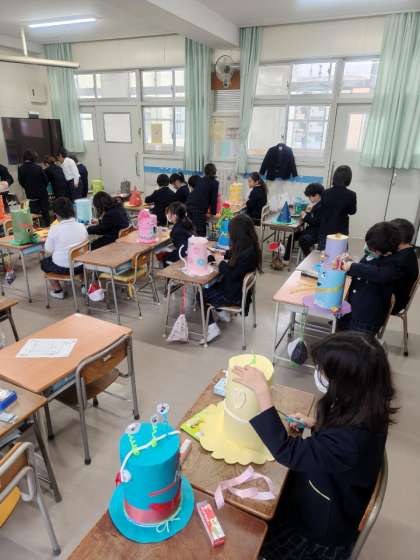 とても素敵な帽子がたくさんできています。ストローや毛糸などいろんな飾りで世界に一つだけの帽子をつくっています。