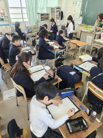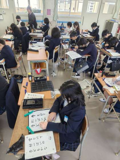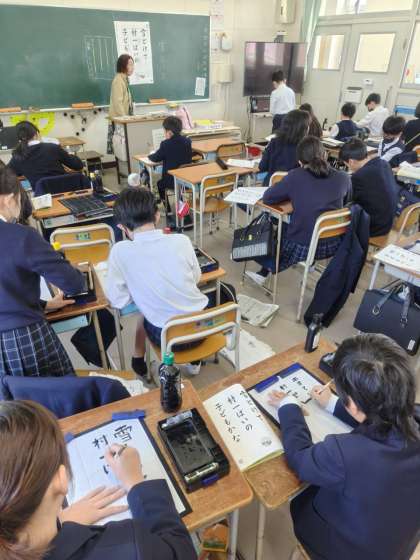 小林一茶の「雪とけて村いっぱいの子どもかな」という句を小筆で書いています。字の大きさや位置などに気をつけて書いていて、いい雰囲気の字が書けています。