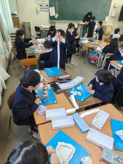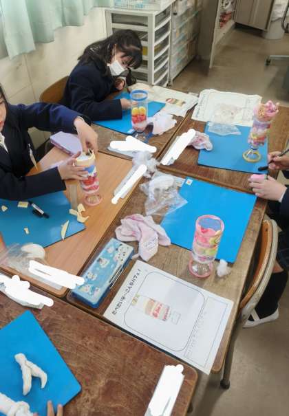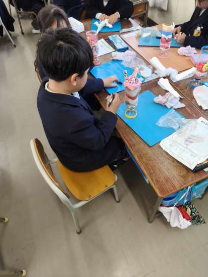 とてもカラフルで美味しそうなパフェができてきています。楽しそうにつくっています。