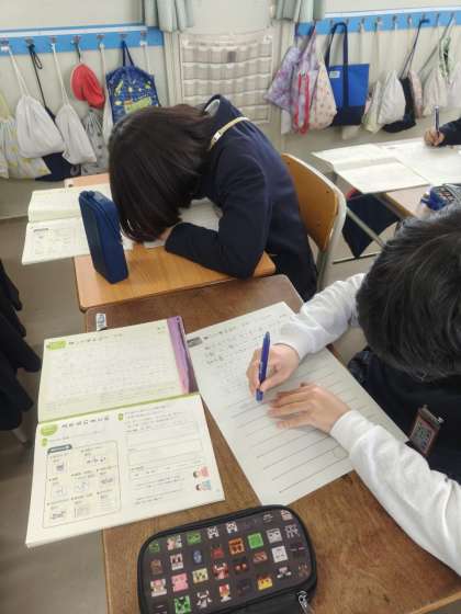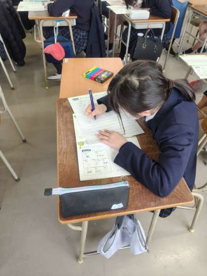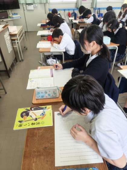 枕草子の文章をなぞったあとお手本を見て自分で書いています。いつもと違う青色のペンで書いています。集中して書いていました。