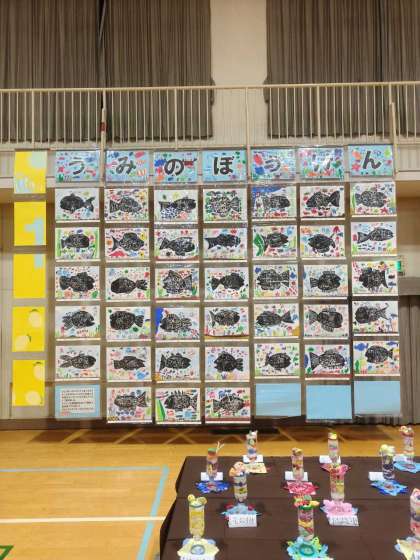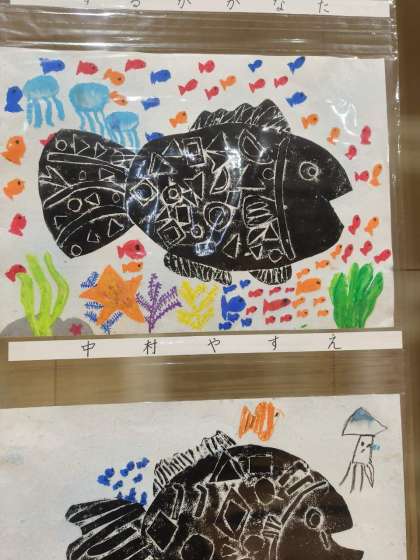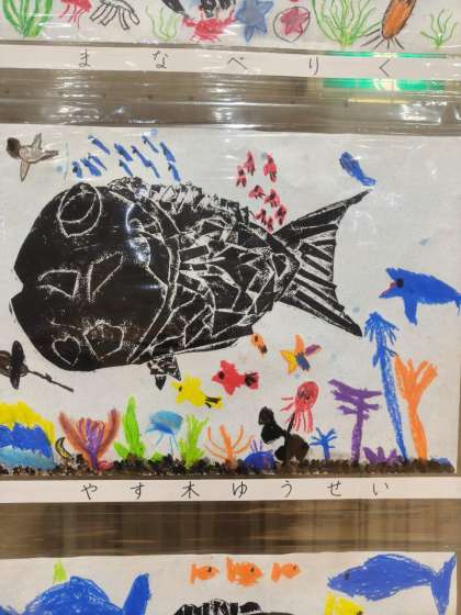 1年生は「うみのぼうけん」というテーマで大きな魚をつくりました。画面から飛び出しそうな魚が泳いでいます。