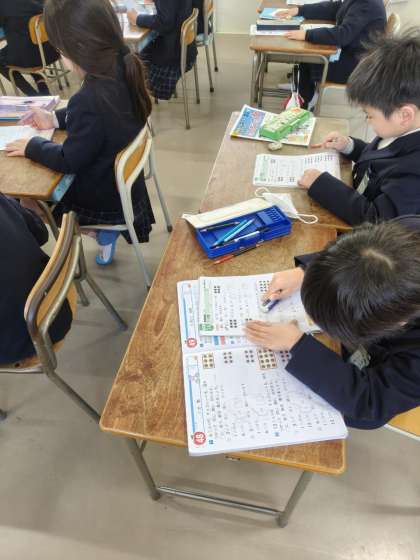 今学習している分数の練習問題を解いているところです。さんちか、ドリルとなれてきてどんどん進んでいるようです。