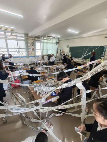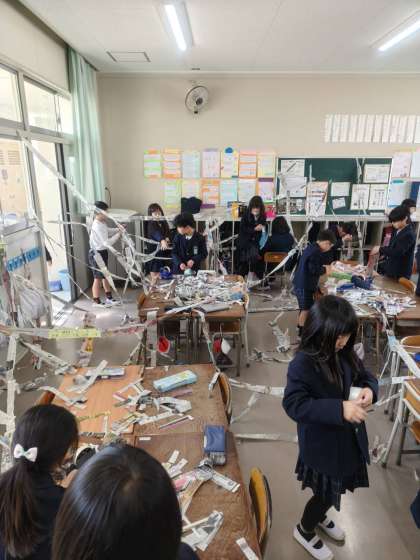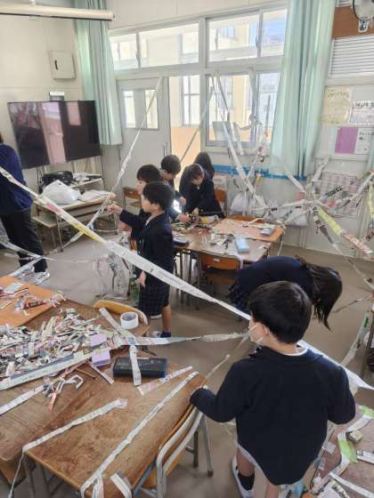 紙を切ってつないではりつけて、を教室いっぱい使ってやっています。とても盛りあがっています。