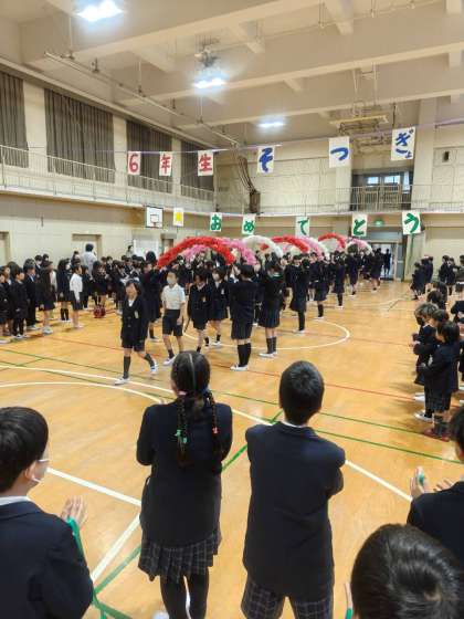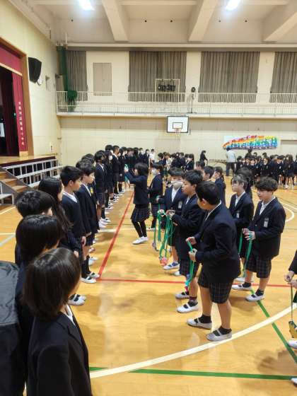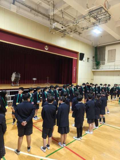 代表委員の司会で会が始まりました。2年と3年の合唱、合奏で入場しました。そのあと4年が用意してくれたメダルをプレゼントしました。