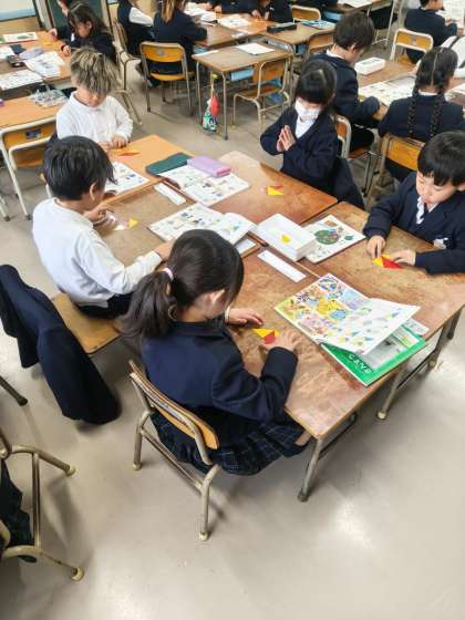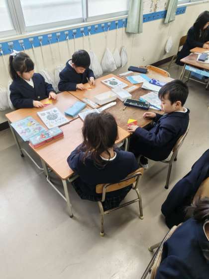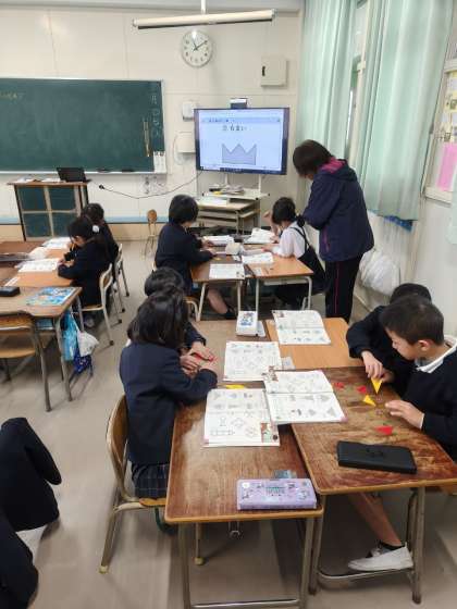 「かたちづくり」の学習をしています。1年生の最後の単元になります。楽しくタイルで形を作っています。