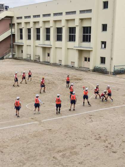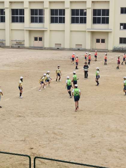 タグラグビーをしています。どこに進めばいいか、パスをどのように出そうかなどチームで頭も使いながら動いています。