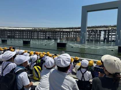 大屋根リングが見える場所から噴水を眺めて、ひと休み。