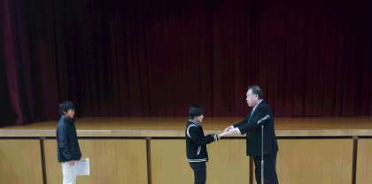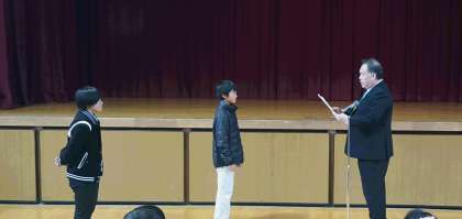 今日の児童朝会で、各学年男女別上位5位までの児童が表彰されました。代表で、6年生が、校長先生から表彰状を受け取りました。