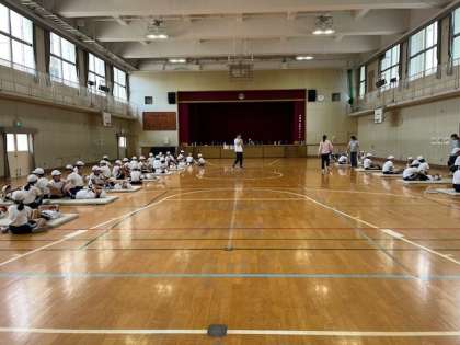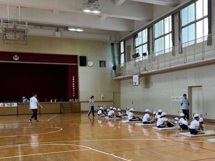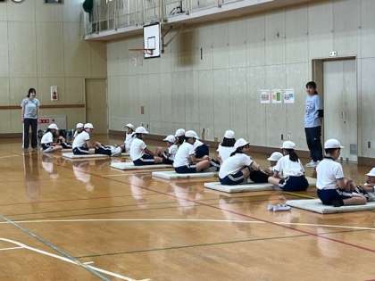 6年生のお兄さんお姉さんにサポートしてもらって、1年生も上手にマットの上で上体を起こすことができました。