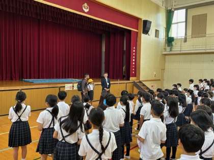 今日は全校朝会で校長先生のお話のあと、転入生の紹介がありました。