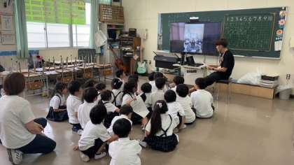 教室には、オンライン越しに思いっきり手を振る1年生の笑顔があふれていました。