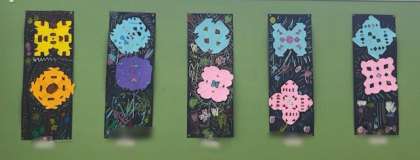 真ん中の写真は1年生の作品です。折り紙を折って切り込みを入れると、あらら不思議。素敵なデザインが仕上がりました。