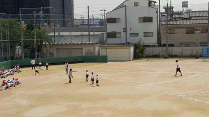 元気いっぱい、全身を使ってソフトボール投げに挑戦しています。