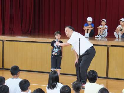 集会のはじめに、歌島小学校の新しい仲間の紹介がありました。