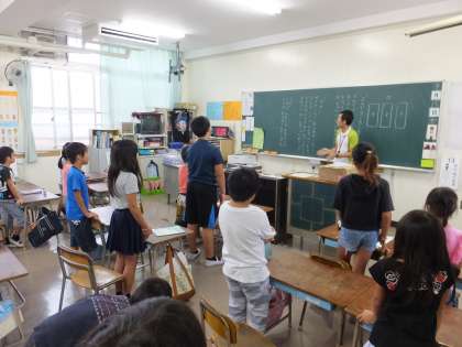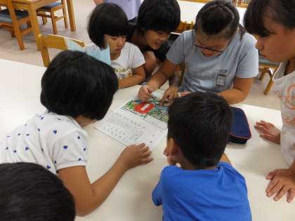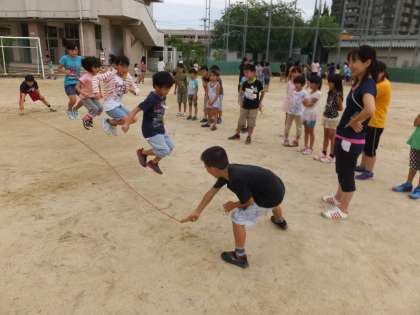 オリエンテーリングの回る順番を確認したり、ポイントで歌う歌の練習をしたりしました。その後、運動場に出て大縄跳びの練習をしました。10回連続で跳べると10点がもらえます。心を一つにしてみんな一生懸命でした。