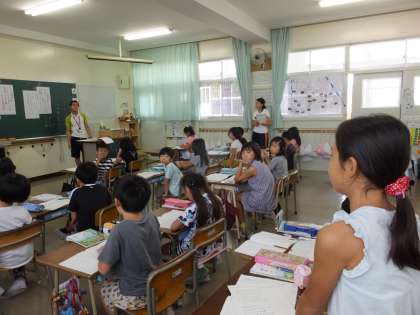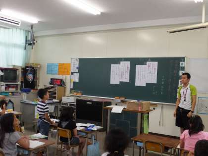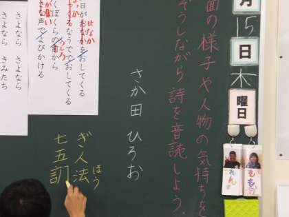 先生の「夕日にうでってあるかな?」の問いかけに「ないよ〜」と笑いながら答える子どもたち。 実際に動作化するなど、楽しく3年生が「詩」を通して、擬人法や七五調について学習しています。