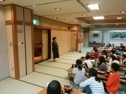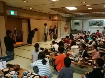 夕食の前に開舎式を行いました。宿舎の女将さんから歓迎のご挨拶をいただきました。