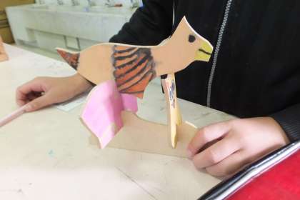 電動糸のこぎりで切った板に色を塗ったり、仕上げをしたりしていました。
