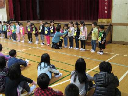 ピカピカの1年生26名を2〜6年生の児童が初めて対面しました。