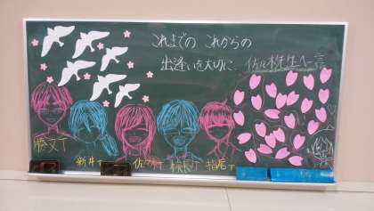 先ほど、卒業式前日の教室の様子をご紹介しましたが、後ろにある黒板にこども達が卒業する思いを描いていましたので、ご紹介します。若い頃の私もいるようです。