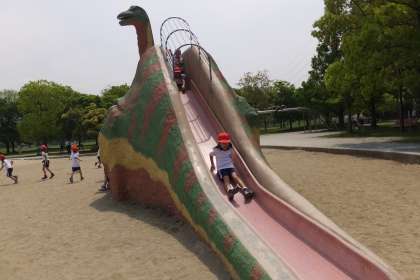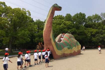 五月晴れの5月12日(金)1年生26名、2年生38名全員で、深北緑地に遠足に行きました。1年生は、初めての校外学習です。大きなリュックサックには、おいしいお弁当と、たっぷりのお茶が重そうに入っています。2年生は、並び方や集まり方で、すばやく動いて、素晴らしいお手本を見せてくれました。みんなしっかり歩いて行くと、大きな恐竜の遊具がある深北緑地につきました。