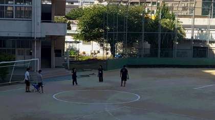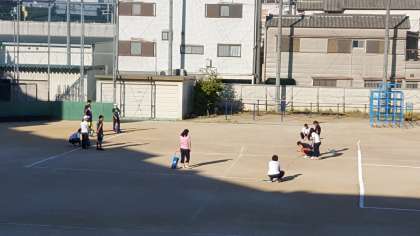 教職員が協力して、明日の親子ドッジのコートを運動場にかいています。