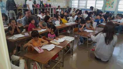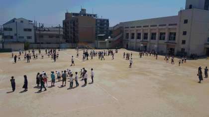 運動場では、2年生と4年生が親子ドッジボールを楽しんでいます。