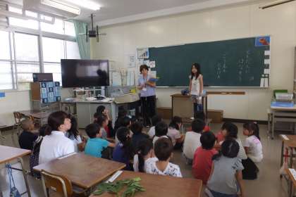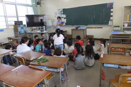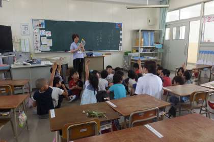 「ぼくは、あおむしを見つけました。」「わたしは、いちょうの木を見つけました。」と、学校に帰ってから教室で、公園をたんけんして、見つけたことをみんなに聞いてもらう発表会をしました。しつもんをする子やくわしく説明してくれる子もいました。