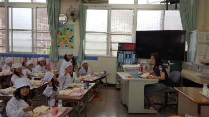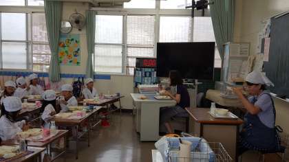 今日は1年1組のみんなと調理員さんが、給食を一緒に食べました。