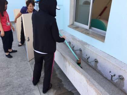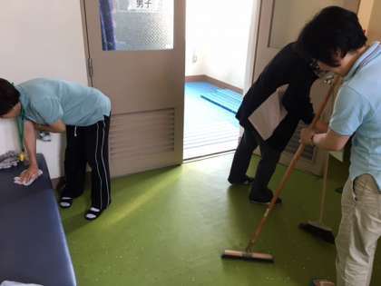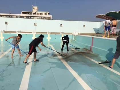 27日(火)のプール開きに備えて、教職員が暑い中プール清掃に取り組んでいます。