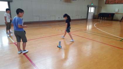 講堂では、3年生が送風機を使って車を走らせています。