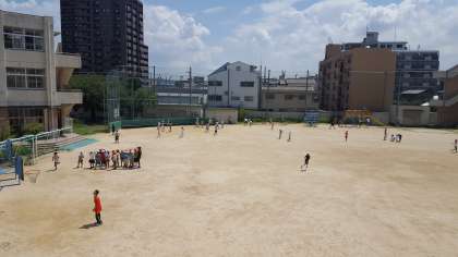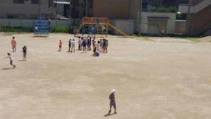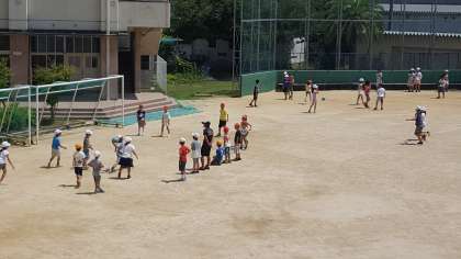 子ども達も先生も、太陽に負けず元気いっぱい運動場で遊んでいます!