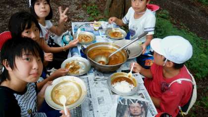 山登りの後は、カレーづくりです。初めて火をおこし、カレーを作ります。早く食べたいよう〜